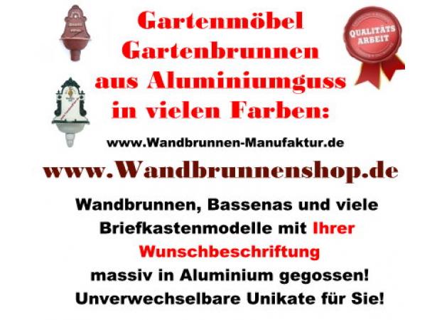 Fertigung von Wandbrunnen, Bassenas und Briefkästen aus hochwertigem Aluminiumguss. Auf Wunsch fertigen wir diese Artikel auch mit Ihrer Wunschbeschriftung - ganz individuell für Sie und in massivem Guss! Ideal auch als persönliches Geschenk zu Weihnachten, zum Richtfest oder zum Einzug!